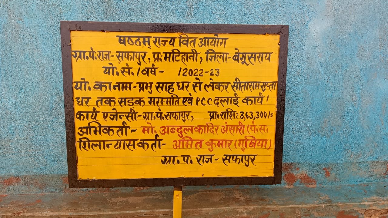 अनंत कुमार का कहना है कि सफापुर पंचायत के वार्ड नंबर 09 में योजना संख्या प्रभु साह घर से लेकर सीताराम गुप्ता घर तक जो पीसीसी कार्य किया गया है। उसकी मोटाई सिर्फ 2 से 3 इंच ही किया गया। ग्रामीणों के द्वारा विरोध करने पर भी जबरदस्ती पीसीसी कार्य किया गया।