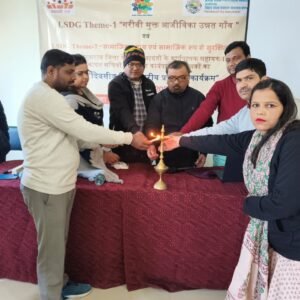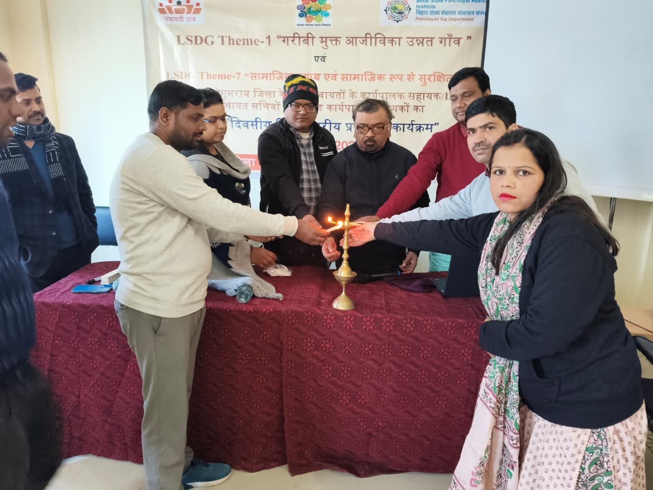 कार्यक्रम का शुभारंभ डीपीआरसी टीम के संजय कुमार, अविनाश कुमार, मीनू रानी एवं रवि कुमार द्वारा संयुक्त रूप से दीप प्रज्वलित कर किया गया। प्रशिक्षण सत्र के दौरान मास्टर ट्रेनर संजय कुमार ने एलएसडीजी थीम-1 गरीबी मुक्त एवं आजीविका उन्नत गांव तथा एलएसडीजी थीम-7 सामाजिक न्याय एवं सामाजिक रूप से सुरक्षित गांव विषय पर विस्तृत रूप से प्रकाश डाला।